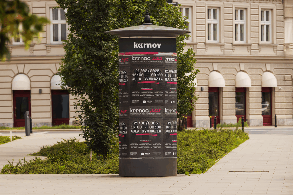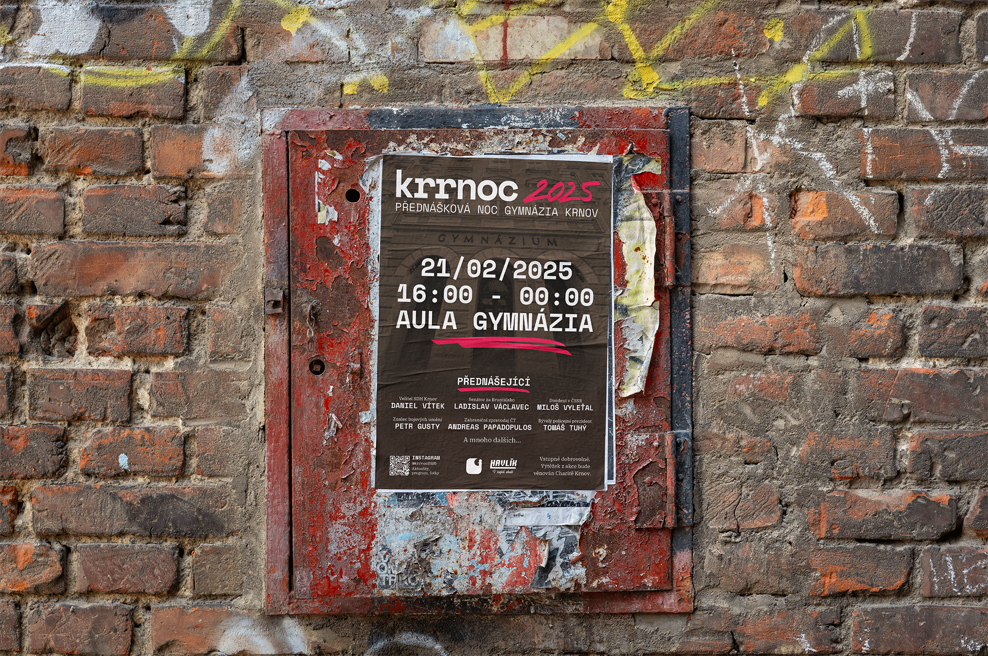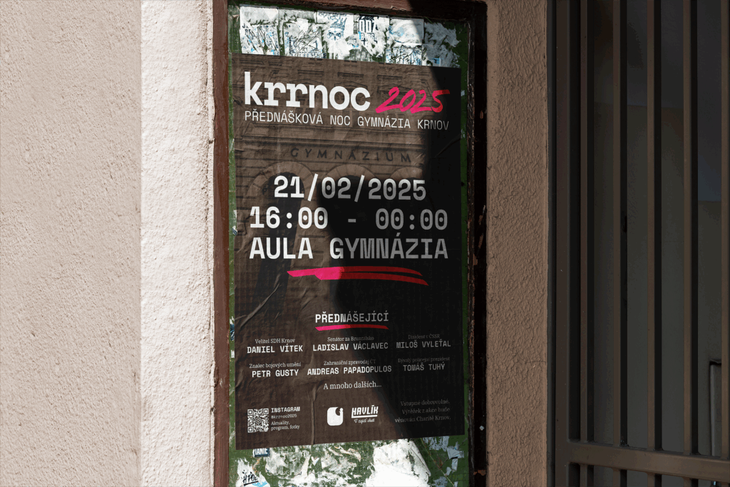 Jednoduchá a velmi ad hoc vizuální identita pro další ročník každoroční přednáškové noci pořádané studenty krnovského gymnázia. Součástí byly především vnější výstupy – plakáty, sociální sítě, merchandising.