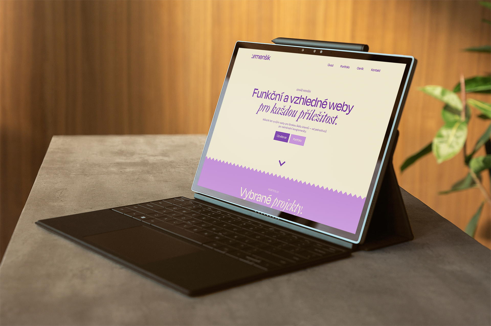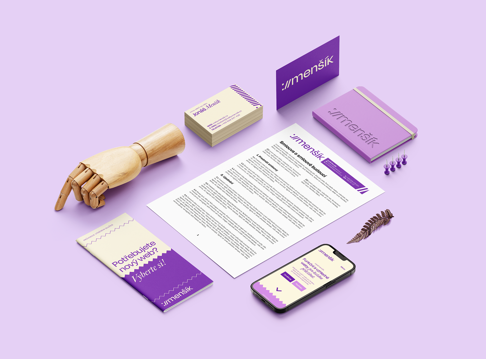 Malá vizuální identita s návrhem webu k tomu pro vývojáře Jonáše Menšíka. Dodržuje stereotypy a užívá speciální znaky (protože jako programátoři), ale zároveň je narušuje barevnou paletou a volbou písma.